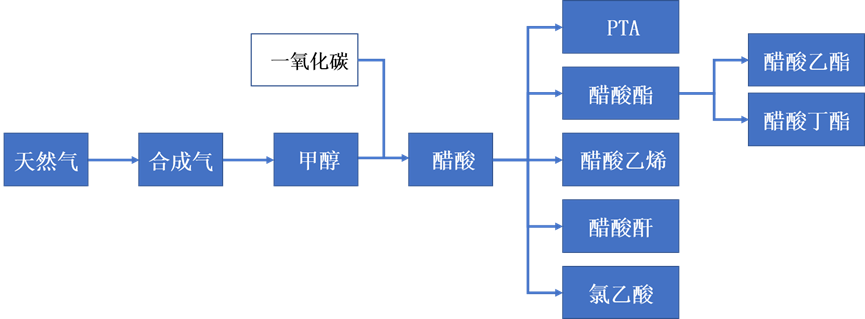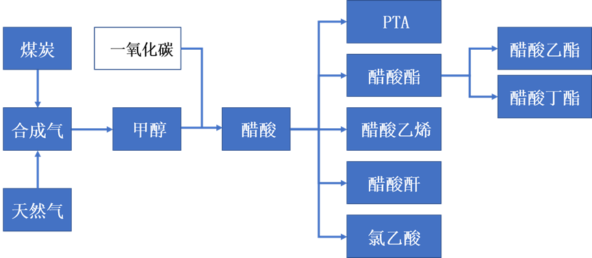 醋酸的制备原料主要是甲醇,而甲醇在国内主要由煤炭和天然气组成的合成气制备,这部分属于产业链上游。中游是醋酸的生产,甲醇中加入一氧化碳通过化学反应生成醋酸,下游主要是利用醋酸加工的化工材料,主要有PTA、醋酸酯、醋酸乙烯、醋酸酐、氯乙酸,其中醋酸酯由可以分为醋酸乙酯和醋酸丁酯。