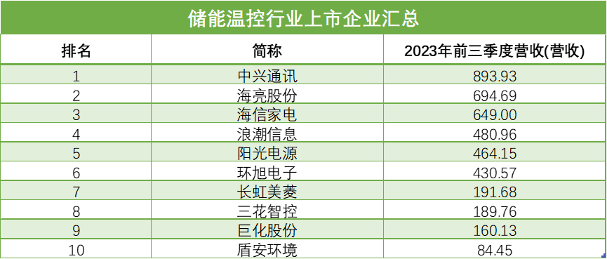 2023年前三季度,储能温控相关上市企业中,9家企业营收超百亿,分别为中兴通讯、海亮股份、海信家电、浪潮信息、阳光电源、环旭电子、长虹美菱、三花智控、巨化股份。从区域分布看,广东企业较多,共有14家,浙江、江苏企业分别有8家、7家。