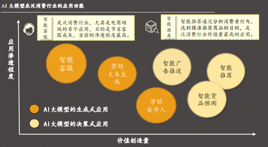 AI 大模型生成式应用包含智能客服机器人、广告营销、营销数字人等。