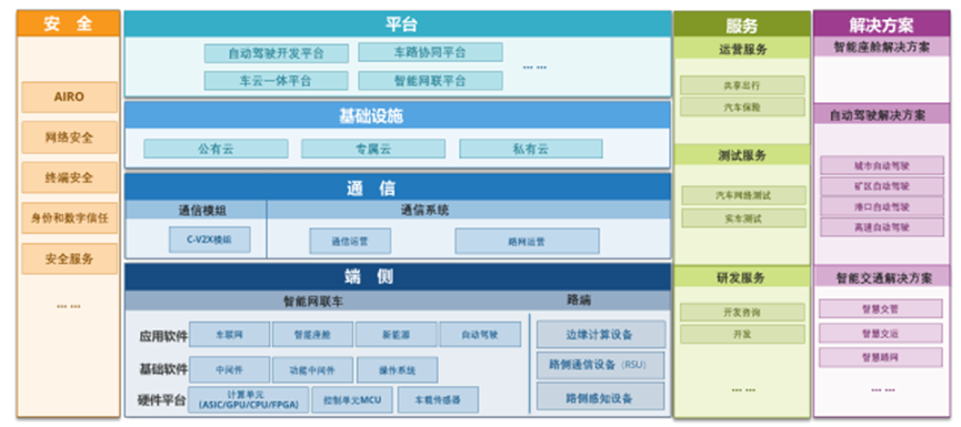 中国车联网市场涉及到车联网平台、路侧基础设施、通信系统、车联网安全和服务等,具体来说路侧设施主要包括路侧感知设备、路侧计算设备、路侧通信设备等。 通信系统指车端、路端通信所需的必要基础设施。车联网平台基础设施为平台提供基础的计算、存储、网络资源;根据部署形态可分为公有云、私有云、专属云等。车联网平台是指利用车载设备与路端设备提供的信息,完成数据处理与应用服务的综合性平台。车联网安全涵盖了车联网领域各个环节所需的安全软件、硬件及服务。具体而言,车联网安全市场包括安全分析、情报、响应和编排(AIRO)、网络安全、终端安全、身份和数字信任、安全服务。服务贯穿车联网各个领域,涉及研发、测试、运营等各类服务。