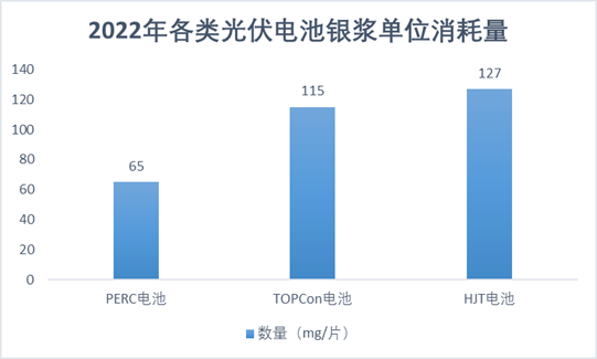 目前光伏电池银浆分为高温银浆和低温银浆两种。p型电池和TOPCon电池使用高温银浆,异质结电池使用低温银浆。银浆在电池片成本中占比较高,目前主要通过多主栅技术以及减小栅线宽度来减少正银消耗量。数据显示,2022年,p型电池片主栅数量从9BB改为11BB及16BB,正银消耗量降低至约65mg/片,背银消耗量约26mg/片;n型TOPCon 电池双面银浆(95%银)平均消耗量约115mg/片;异质结电池双面低温银浆消耗量约127mg/片。