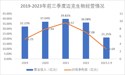 2023年前三季度,迈克生物实现营业收入21.15亿元,同比下降22.19%;归母净利润为2.69亿元,同比下降55.27%。2023年上半年,公司主营产品包括自主产品和代理产品,营收占比分别为62.76%、35.92%、1.33%。