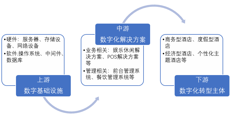 酒店数字化产业链由数字基础设施、数字化解决方案提供商、数字化转型主体构成。上游数字基础设施供应端主要包括基础硬件以及基础软件,其中基础硬件主要包括服务器、存储设备、网络设备等;基础软件主要包括操作系统、中间件、数据库等。中国酒店数字化解决方案提供商主要包括业务相关解决方案与管理相关解决方案,其中业务相关解决方案主要有娱乐休闲解决方案、宾客满意度提升解决方案、POS解决方案、周边应用解决方案等;管理相关解决方案包括前台管理系统、餐饮管理系统、采购与成本管理系统、人力资源管理系统等。下游为数字化转型主体,即酒店。