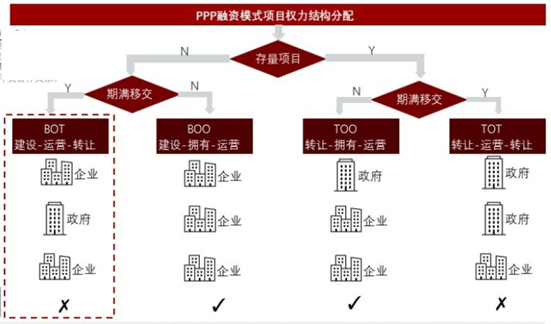 首先,政府针对具体项目特许新建一家项目公司,并对其提供扶持措施,然后由项目公司负责进行项目的融资和建设。项目建成后,由政府特许企业进行项目的开发和运营。根据政府对不同项目建设权和控制权的归属要求,PPP项目又分化出了BOT、BOO、TOO、TOT等多种模式。