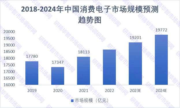 根据市场调研数据显示,2022年中国消费电子市场规模达到近19000亿元,近五年年均复合增长率为2.97%。预计2023年中国消费电子市场规模将增至19201亿元,2024年将达到19772亿元。