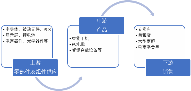 消费电子产业链上游为显示屏、锂电池、电声器件、光学器件、射频器件、连接器、外壳等组件的供应,市场主要参与者有深天马、珠海冠宇、歌尔股份、欧菲光等;中游为产品的组装及封测过程,主要包括智能手机、PC电脑、智能穿戴设备、TWS耳机、智能家居产品、汽车消费电子等,代表企业包括华为、联想、小米等;下游为产品的销售环节,主要的销售渠道有专卖店、大型商超等。