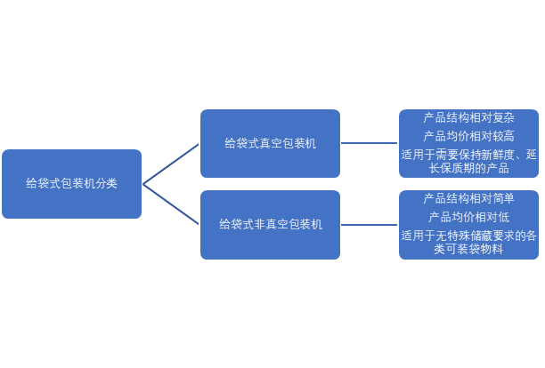 给袋式包装机指自动完成对预制袋的取袋、打印、开袋、物料计量、充填、封口、输出等工序的包装机。按照工作流程的不同,给袋式包装机可分为给袋式真空包装机与给袋式非真空包装机,相较于后者,给袋式真空包装机多了“将产品装入包装容器后,抽去容器内部的空气,达到预定真空度”的工序。