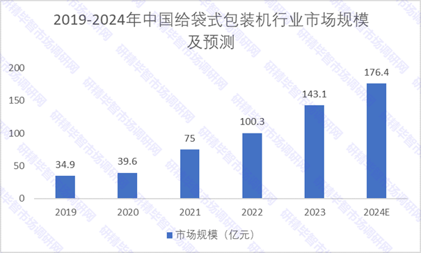 根据研究报告显示,中国给袋式包装机行业市场规模由2019年的34.9亿元增长至2023年的143.1亿元,年均复合增长率达42.3%;预计2028年整体市场规模有望增长至370.7亿元,2024年至2028年年均复合增长率达20.4%。其中给袋式真空包装机市场规模在总体市场中占比较大。