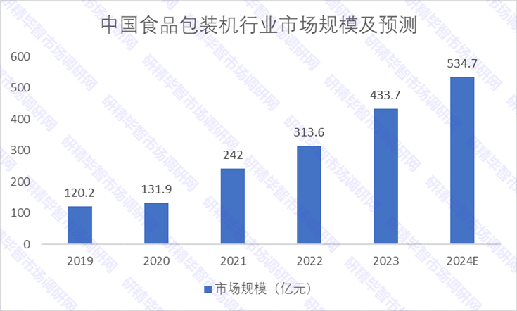 根据研究报告显示,中国食品包装机行业市场规模由2019年的120.2亿元增长至2023年的433.7亿元,年均复合增长率达37.8%;预计2028年整体市场规模有望增长至1,158.5亿元,2024年至2028年年均复合增长率达21.3%。