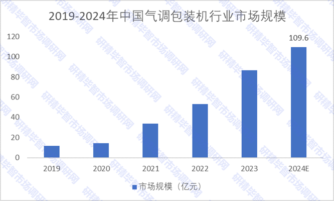 市场调研数据显示,中国气调包装机行业市场规模由2019年的11.8亿元增长至2023年的86.7亿元,年均复合增长率达64.7%;预计2028年整体市场规模有望增长至254.9亿元,2024年至2028年复合增长率达23.5%。