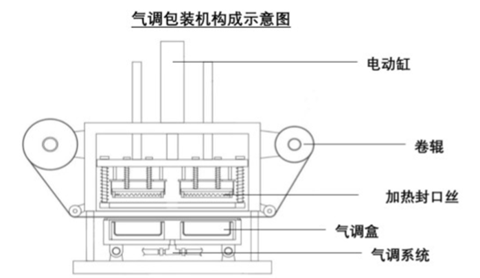 气调包装机主要由电动缸、卷辊、加热封口丝、气调盒及气调系统构成。工作原理为将待包装物放入气调盒,气调盒进入气调包装机的真空室,真空泵抽真空使真空室达到最低的真空度和残氧量,再使用气调包装法充入单一或混合气体(通常为二氧化碳、氮气、氧气、氩气等),最后用封口膜进行热封,完成包装流程。