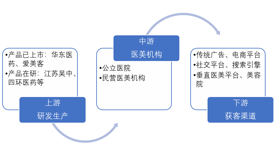 医美再生注射剂上游是再生注射剂研发生产企业,近年来不断有本土企业以自主研发或收并购、获取代理权的方式进入市场;中游为医美机构,上游企业以直销为主要模式进入中游,除此之外还有代理商经销、公立医院整形外科、皮肤科及民营医美机构;下游为线上及线下各类获客渠道,包括传统广告、电商平台、社交平台、搜索引擎、垂直医美平台等。