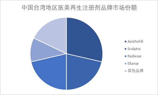 中国台湾地区逐步形成以微整形为核心的医美产业,除本地消费者外,每年有大量大陆地区及东南亚部分国家消费者前来注射再生类产品。根据市场调研数据显示,目前市场以AestheFill、Sculptra、Radiesse 和Ellanse为主要品牌,其中AestheFill在台湾地区的销售量近年来已超过老牌童颜针Sculptra,以近30%的份额占据市场第一。