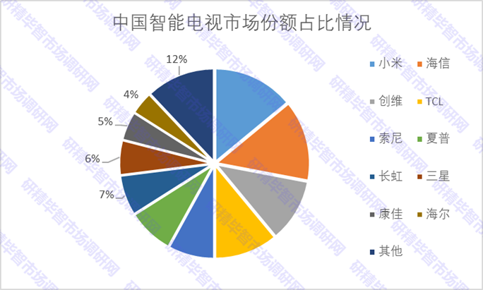 中国智能电视是市场集中度较为分散,其中小米、海信占比相同,排名第一;海信和TCL,占比第二;索尼和夏普占比第三;长虹占比7%,三星占比6%,康佳占比5%,海尔占比4%,其他占比12%。