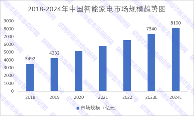 调研报告显示,2022年智能家电市场规模超6500亿元,同比增长13.75%。研精毕智分析师预计2023年智能家电市场规模将达7304亿元,2024年智能家电市场规模将达8100亿元。