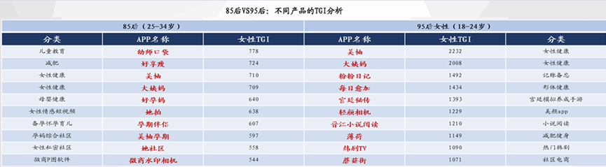 95后女性(18-24岁):作为刚进入大学或者刚步入社会的95后少女们,大部分并未进入婚姻生活,生活以“悦己”为主,娱乐休闲活动丰富多样,运动、购物、手游、追剧、读小说等都备受追捧;值得注意的是,无论是85后还是95后,都经常使用美柚和大姨妈这类女性健康管理软件。由此可见不同年龄层的当代女性健康管理意识都非常强。
