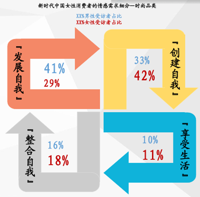 中国女性不仅追求消费的快乐与满足,同时热衷成功和社会地位的提升,她们对创造独特的自我形象有很强烈的需求,需要有存在感,成为生活的主角,因此她们在时尚产品和高档消费品的选择上非常有主见;