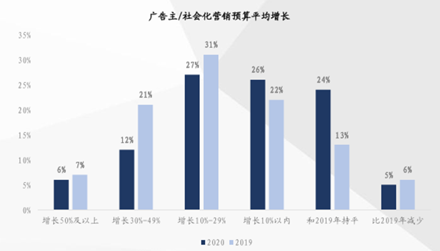 社会化营销预算增加,KOL、短视频/直播营销成为广告投入重点。社会化营销预算投入:71%的广告主2020年社会化营销预算同比增长15%;社会化营销渠道:KOL推广依然是广告主202年的首要投入渠道,社群运营/私域流量异军突起,成为超半数广告主的投入重点;营销技术:数字营销不断向智能化变迁,营销人工智能成为广告主最为关注的数字营销技术,数字营销不断向智能化变迁,营销人工智能成为广告主最为关注的数字营销技术;营销媒介:广告主对短视频/直播的重视程度较去年上升明显,比例达53%;广告主对官方微信账号运营的重视程度则较去年有所下降。