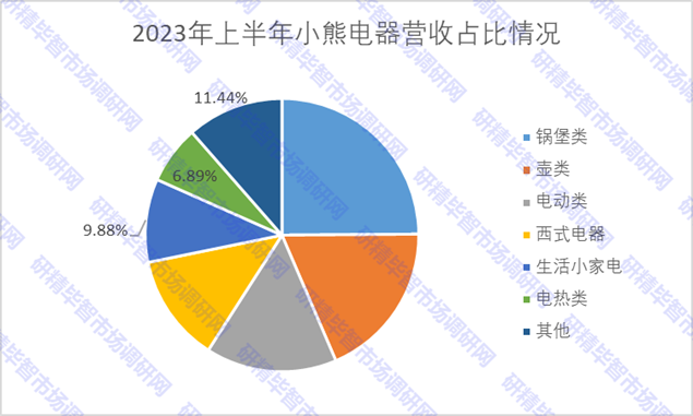 研究报告显示,2023年上半年,小熊电器主营产品包括锅煲类、壶类、电动类、西式电器、生活小家电、电热类,占比分别为24.88%、18.67%、15.51%、12.73%、9.88%、6.89%。