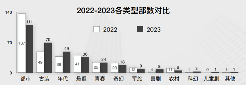 古装剧作为常?赛道,2023年进?步升温,爆款多、影响?持续?涨,其“现实之外造梦”的特征也迎合了?众对情绪价值和娱乐性的观剧需求。都市剧播出数?最多,但因缺乏新意难出爆款,年平均景?仅0.95,2023年疲态难掩;年代剧在共同记忆回溯加持下?强,?春剧有少?惊喜;科幻剧贡献头部?剧《三体》表现惊艳。