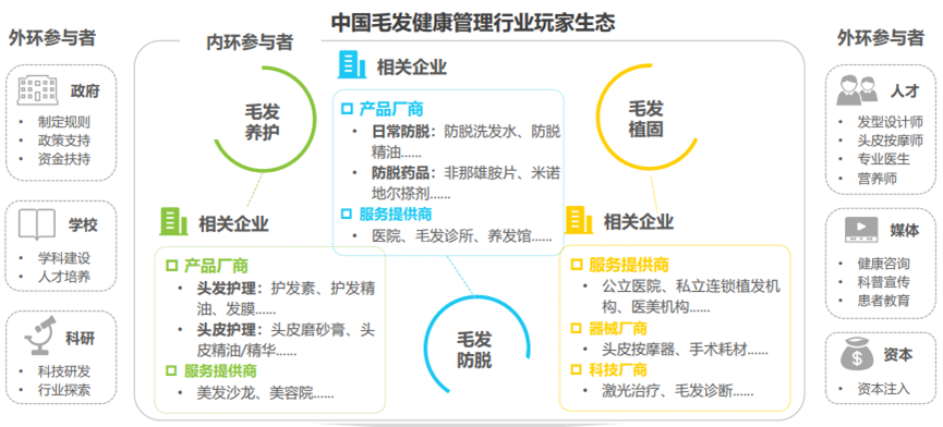 毛发健康管理行业玩家类型较多,市场整体呈现参与者众多并趋于相互渗透的态势。内环厂商主要以毛发养护、防脱、植固三大赛 道分别的产品、服务提供商为主,各自搭建自身领域的产品与服务体系。外环参与者则主要包括政府、科研机构、学校、媒体等众 多主体,一方面通过外部政策、科研、资金等支持助力行业快速向前,另一方面则通过人才输送、媒体传播等支持内环厂商的商业 发展。全行业参与者共同努力,致力于更好地服务终端消费者,共建良性行业服务生态。