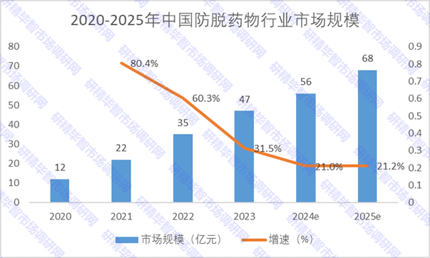 研究报告显示,目前中国脱发人群突破2.5亿人,每6人中就有约1人受脱发影响,同时流行病数据显示,全球雄脱患者都呈现加速上升趋势,未来随着脱发患者的不断增多,相关药物的市场前景将更为广阔,因此防脱药品市场近年将呈现持续扩张的态势。2021-2023年,防脱药品市场规模增速逐步放缓,由于疫情影响,民众大多居家办公,对于个人形象在意程度不高,因此购买防脱药品意愿不够强烈。2023年后,防脱药品市场规模将稳定增长。