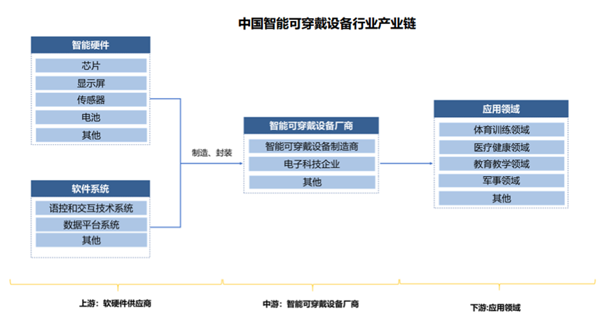 中国智能可穿戴设备行业产业链上游参与者包括智能硬件供应商和软件系统服务商,其主要 为智能可穿戴设备提供核心的智能硬件及软件技术支持。智能硬件主要包括芯片、显示屏、 传感器、电池等。软件系统主要包括语控和交互技术系统、数据平台系统等。中国智能可穿戴设备行业中游参与者包括智能可穿戴设备厂商,电子科技企业等。下游为各应用领域,得益于智能可穿戴设备技术的发展,中国智能可穿戴设备在医疗、教育、体育以及军事等领域的应用不断深化。