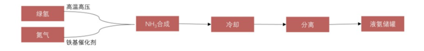 反应压力20-50MPa,反应温度350-500℃,在铁基催化剂作用下,绿氢和氮气合成绿氨。