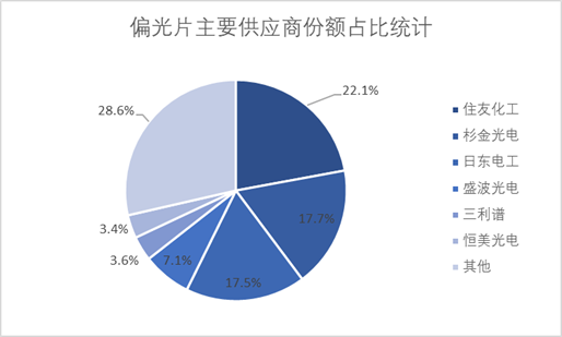 近年来,偏光片企业不断扩大产能、偏光片投融资向好。从企业市场规模占比来看,住友化工市场份额占比最高,达22.1%。其次,本土企业杉金光电积极建设全球领先的偏光片产线,市场份额占比达17.7%。日东电工、盛波光电、三利谱、恒美光电占比分别为17.5%、7.1%、3.6%、3.4%。
