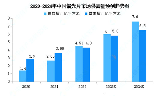 我国是偏光片产销大国,市场需求量巨大。根据市场调研数据显示,2022年中国偏光片供应量为4.51亿平方米,同比增长70.2%;偏光片需求量为4.3亿平方米,同比增长19.4%。行业研究报告预测,2024年我国偏光片供应量和需求量将分别增至7.6亿平方米、6.5亿平方米。