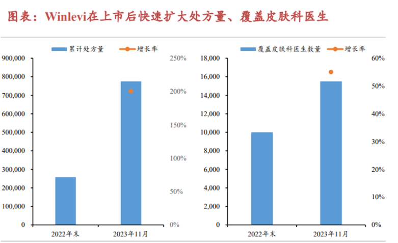 市场调研数据显示,Winlevi在上市后前4月处方量快速增加,单月处方量整体上高于其他痤疮新药刚上市阶段,截至2022年末、2023年11月,Winlevi的累计处方量分别达到25.8万、77.5万,覆盖医生数量分别达到1.00万人、1.55万人(占全美皮肤科医生93%),实现了快速推广。