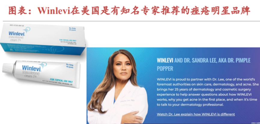三生制药引进全球首款获批上市的雄激素受体抑制剂1%克拉考特酮乳膏剂Winlevi,桥接试验近期获批。Winlevi是首款外用雄激素受体抑制剂,近40年来FDA批准的首款具有新作用机制的外用痤疮药物,其外用属性使安全性大大提升,相对口服制剂增加了男性患者人群(避免全身吸收引起女性化)。在美国获得了知名皮肤科专家PIMPLE POPPER(以擅长解决皮肤问题闻名于网络)推荐,自2021年12月上市以来已成为美国处方量最大的痤疮治疗用药。