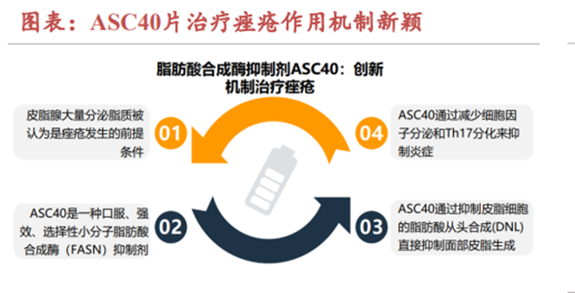 研究报告指出,2023年1月,歌礼制药宣布启动口服脂肪酸合成酶抑制剂ASC40片治疗中/重度寻常性痤疮的III期临床试验完成首例给药,复旦大学附属华山医院项蕾红教授担任这项III期临床试验的主要研究者。除痤疮以外,ASC40片还有NASH、复发胶质瘤适应症相关临床试验在同步推进中,该品种的安全性有望被逐步佐证。