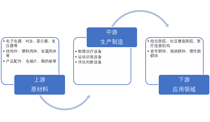 中国康复医疗器械产业链可以分为上游、中游和下游三个主要部分。上游主要是原材料供应,包括电子电器类、结构件类、产品配件类、包装材料等。这些原材料是康复医疗器械生产的基础,涉及到多种行业,如电子制造、机械制造、生物化学、材料等。中游为康复医疗器械的生产环节,主要包括物理治疗设备、运动训练设备、评估判断设备等。这一环节涉及到研发、制造、销售及相关服务,是产业链中的核心部分。下游则是应用领域,包括综合医院、社区康复医院、康复医院、医药连锁机构、养老院及个人消费者等。