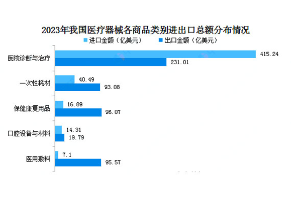 中国康复医疗器械的进出口情况显示了该行业的快速发展和国际竞争力。从出口方面来看,2023年中国保健康复用品的出口额达到了96.07亿美元,超过了670亿元人民币,占比17.94%。这一数据表明,康复器械已成为国内医疗器械出口的主力军,且在国际市场上具有较强的竞争力。特别是在美国市场,国产康复辅具占据了90%的市场份额,凸显了中国康复医疗器械在全球市场的影响力。