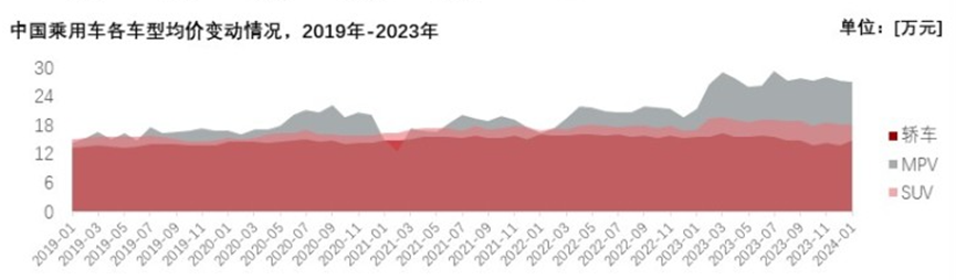 研究报告显示,2023年,轿车、SUV、MPV车型的销售冠军车型的入门价格分别为7.86万元、25.89万元、23.29万元。而从均价情况来看,轿车、SUV、MPV车型的数据分别为15.18万元、18.77万元、27.01万元。SUV和MPV由于其更大的尺寸、更复杂的驱动系统、以及更高的性能要求,其生产成本普遍高于轿车。但从横向变动情况来看,在自动驾驶和新能源的价值量加持下,各车型的均价都随着时间的推移上升了,轿车车型的均价已经从2019年的13.79万元增长至15.18万元。