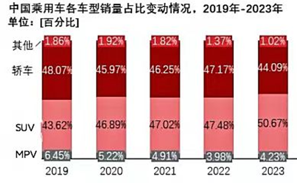根据市场调研发现,2019年,轿车在乘用车市场销售总量的占比达到了48.07%,但到2023年已下降至44.09%。相对的,SUV的占比从43.62%增长至60.67%。