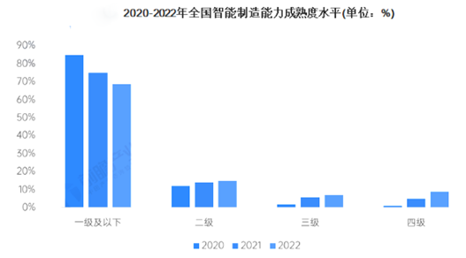 根据市场调研的数据显示,2022年,全国制造业智能制造能力成熟度较2021年有所提升,市场调研数据显示一级及以下的低成熟度企业占比减少6个百分点,三级以上的高成熟度企业数量增加了5个百分点。