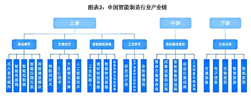 产业链上游主要包括原材料供应商、设备和技术提供商等。中游主要涉及智能制造的核心环节,包括智能工厂的建设和运营、智能生产线的设计和实施、以及智能制造系统解决方案的提供等。这一环节的企业可能同时承担着研发、生产和销售的职能,是智能制造产业链中的核心力量。下游主要包括产品和服务的最终用户,以及通过销售、维修、升级等服务为用户提供价值的机构。