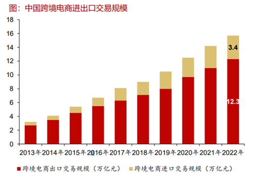 行业研究报告显示,中国跨境电商出口占比近80%,进口增速较快。2022年我国跨境电商出口交易规模12.3万亿元,进口交易规模3.4万亿元。其中2013-2022年跨境电商进口交易规模CAGR增速为23.7%,出口交易规模的CAGR增速为18.4%。