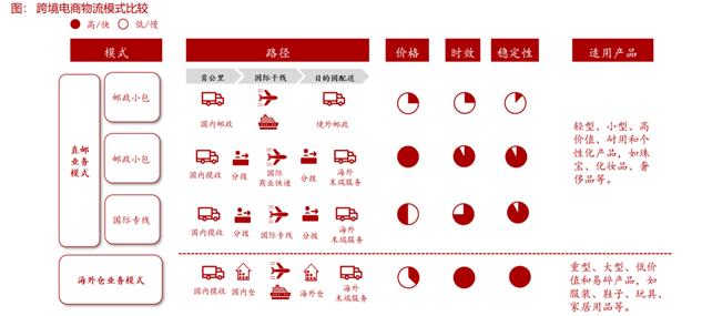 当前跨境电商物流模式主要有两种直邮业务和海外仓。直邮模式按照价格、时效和稳定性的差异可以分为邮政小包、商业快递 和国际专线。