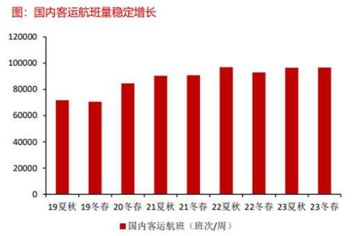 大型货机共50架,中小型货机共173架。、国内客机腹舱运力供给稳健,客运航班量持续增长。根据市场调研数据显示,2019年至2023年,国内客运航班量稳中有升,23冬春航季国内客运航班约96651班次/周,同比+4%,较19冬春航季增长37%。