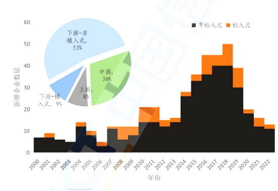 从增长趋势看,企业新增速度下降。美国“脑计划”的启动时间以2013 年为分水岭,此时间节点之后脑机接口技术被业界看好,全球新增企业数量快速增长并持续到2018 年。2019 年以后受疫情波及, 供应链和合作交流一度受限,脑机接口技术应用前景尚不明朗,经济衰退导致投资人投资态度更加谨慎,轻资产特点的脑机接口企业 获得资金渠道受限,部分企业倒闭以及新增企业数量放缓。
