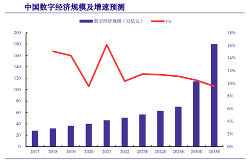 2012 年以来,我国数字经济平均增速15.9%,已连续11 年显著高 于GDP 增速,数字经济持续发挥经济“稳定器”、“加速器”作用。根据市场调研数据预测,2023-2035 年中国数字经济占GDP 的比重将持续提升,2030 年占比达到59.73%,有望追上发达国家平均水平,预计2035 年占比将达到71.60%。