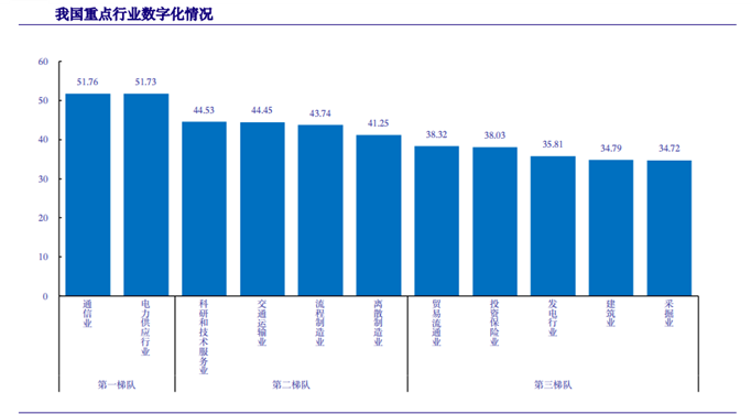 从发展水平来看,通信、电力供应行业数字化转型指数远高于国企平均水平,处于数字化转型第一梯队;科硏和技术服务业、交通运输业、流程制造业、离散制造业数字化转型指数略高于国企 平均水平,处于数字化转型第二梯队;