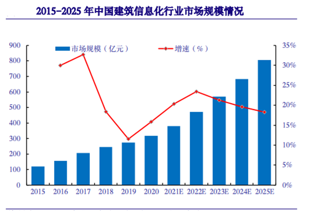 我国建筑信息化市场规模逐年上升。据行业研究报告数据,全球建筑数字化行业市场规模从2015 年的28.13 亿美元增长至2020 年的56.04 亿美元,预计2026 年市场规模达到133亿美元,2020-2026 年CAGR在15%左右。我国建筑信息化行业市场规模从2015 年的120 亿元增长 至2021 年的381 亿元,随着渗透率持续提升,市场规模将继续增长,预计2025 年市场规模达到806.8 亿元。