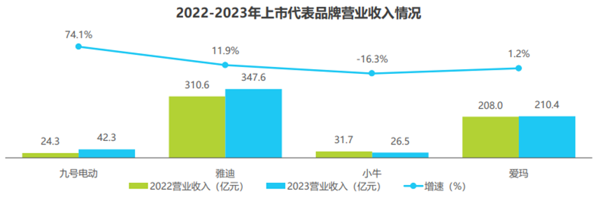研究报告指出,2023年,上市品牌中九号、雅迪、爱玛营业收入均呈现一定幅度的增长,而小牛由于销量下滑,营业收入下降16.3%;九号在高端 两轮电动车市场进一步发展,单车平均收入2876.2元,并且M系列、Dz 110P等高端车型售价均在万元,相比之下传统品牌代表雅 迪的单车平均收入下降至1488.2元。