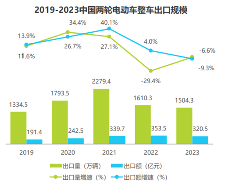 市场调研数据显示,2023年中国两轮电动车整车出口量为1504.3万辆,出口额为320.5亿元,同比下降6.6%和9.3%,下滑速度放缓;出口规 模前四的省份,出口量均达到百万级;2021年疫情导致海外两轮电动车市场火爆,相应带动中国两轮电动车出口量剧增,高峰期过 后市场回归正常,预计未来进入稳定增长期。
