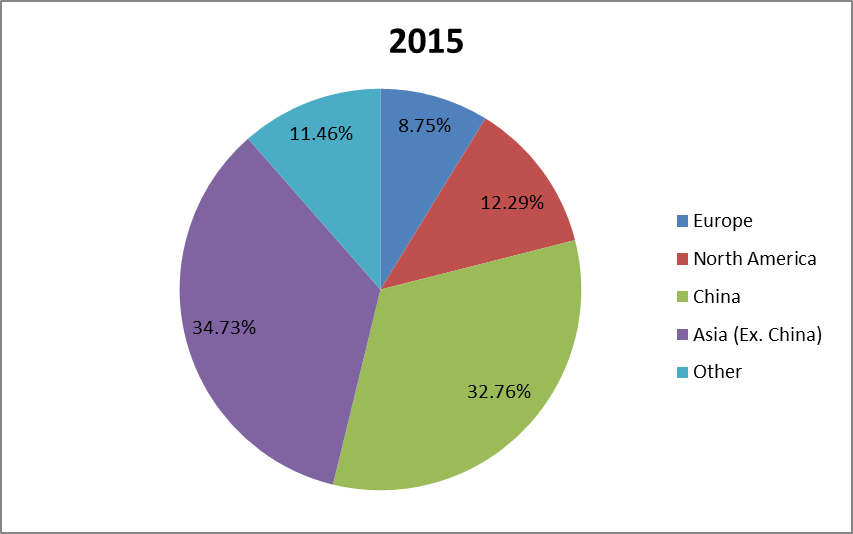 2.中国制造技术发达,劳动力成本低,是最大的供应商,2015年生产市场份额超过32%,亚洲其他地区在全球的市场份额也超过34%。