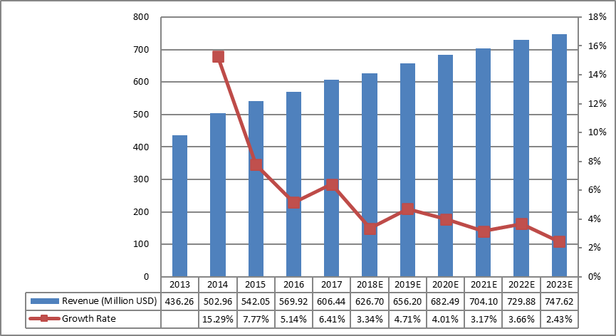 就收入而言,2017年全球激光直接成像(LDI)系统市场收入为60644万美元,预计2023年将达到74762万美元,2017年至2023年的复合年增长率为3.55%。